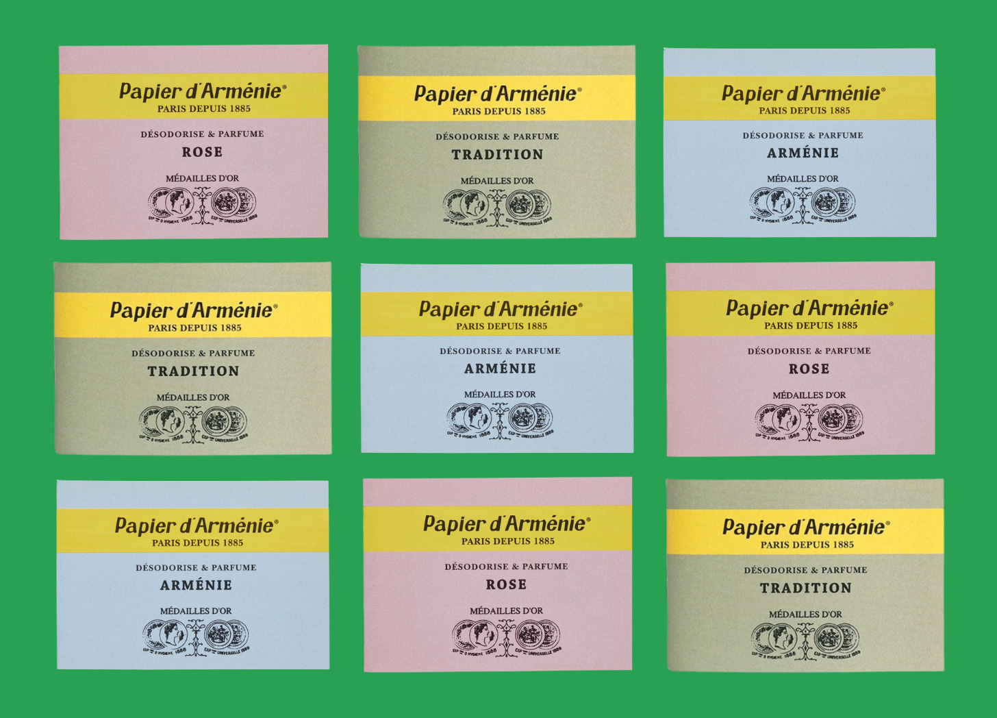 I discovered Papier d’Armenie while I was shopping around in Berlin last month. Founded in France in 1885, the company makes palm-sized scented paper booklets. You rip out a strip from the booklet, then can either light it on fire and it burns slowly to diffuse the scent or you can stuff the strips in a dresser drawer or on a bookshelf to give everything a hint of the smell.